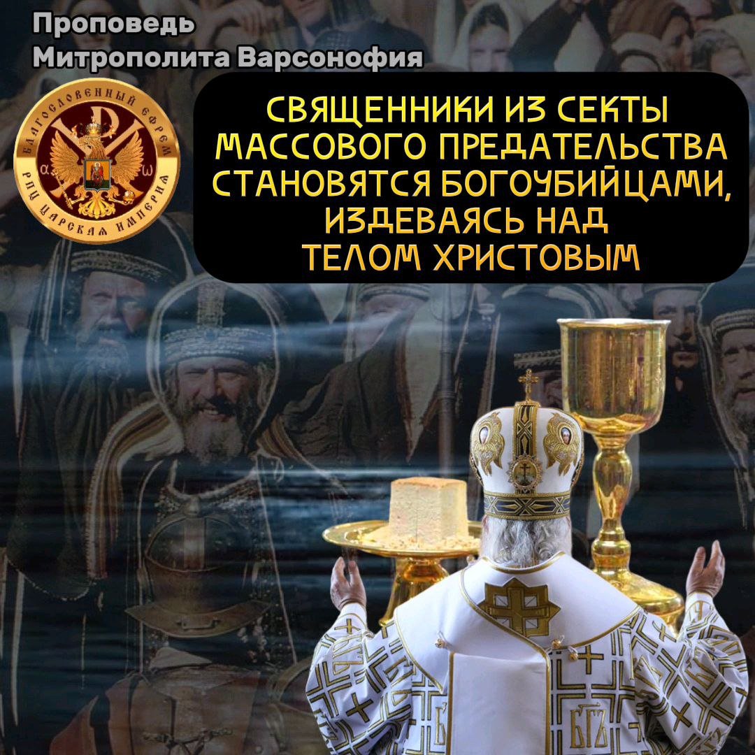 Проповедь Митрополита Варсонофия «Священники из секты массового предательства, становятся БОГОУБИЙЦАМИ, издеваясь над Телом Христовым!» Смотри также: Послания Державного Патриарха Зосимы Открытый суд Державного Зосимы Стоп-Хабад РПЦ МП — блудница Апокалипсиса